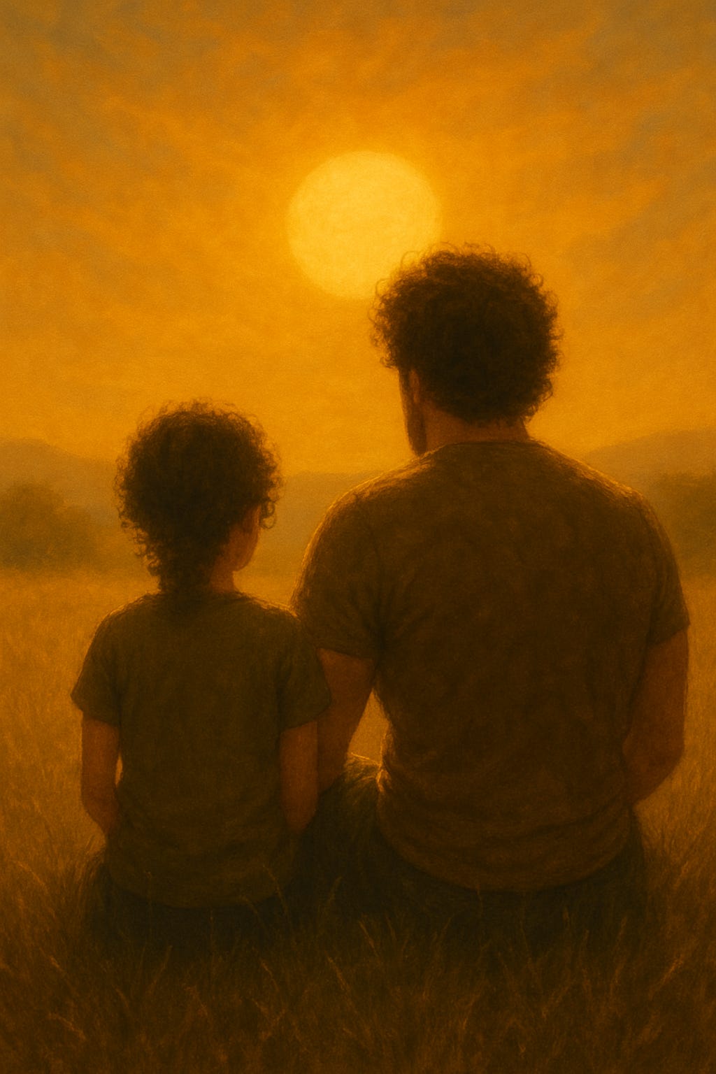 (He sits down gently beside Little Alex on the grass, the air still, the sun low.)
